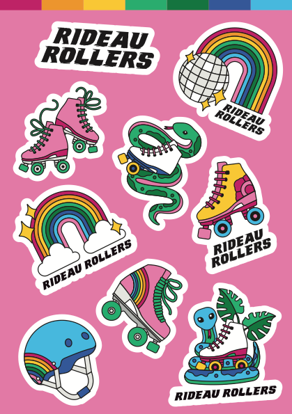 Roller skating stickers from Canadian artists including Luck and Lavender, Radical Buttons,...