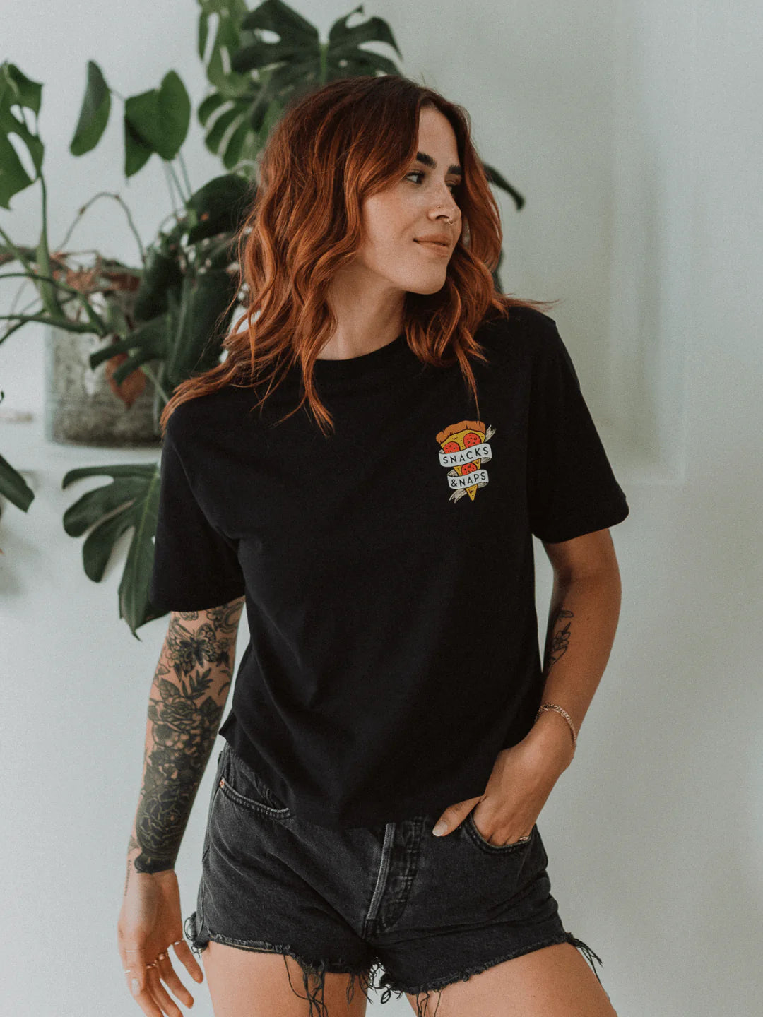 Dive into the ultimate comfort zone with the Snacks and Naps T-Shirt. Crafted with a touch of luxury, this tee is made of mid-weight cotton jersey fabric, offering a gentle embrace to your skin. Its relaxed, boxy silhouette smoothly transitions into a straight-fit torso. The ribbed crew neck collar adds a refined touch, ensuring the Snacks and Naps T-Shirt is your go-to for those laid-back, snack-filled days.